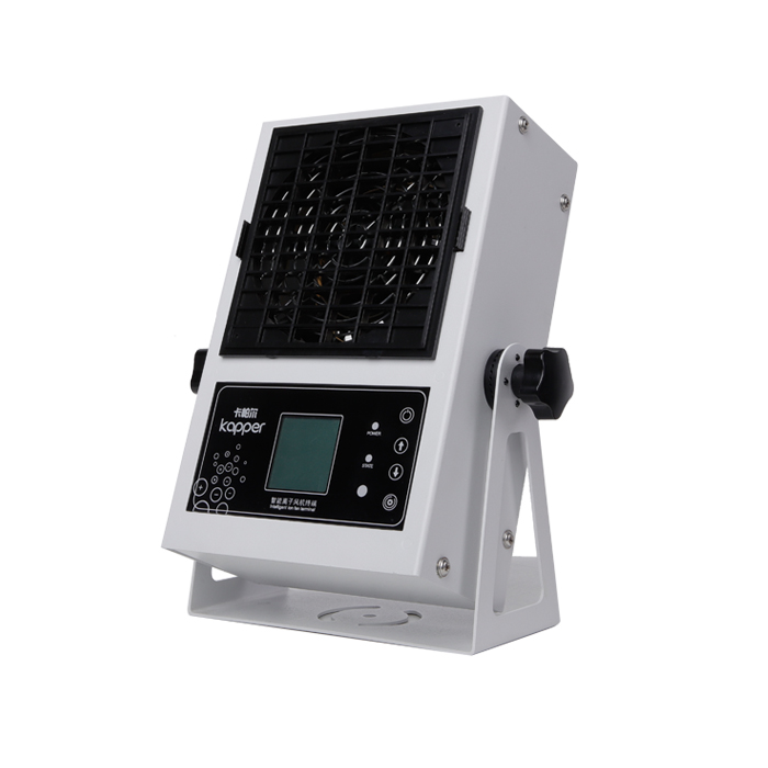 KP101C第六代智能型臺式離子風機由小風機提供風力,風力大小可在觸摸按鍵或遙控器中進行調節。